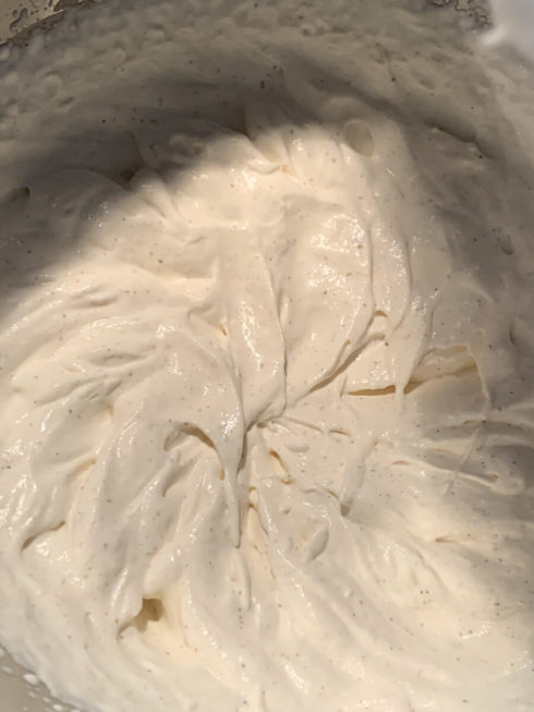 - Sahne mit Muskatnuss verrühren und steif schlagen.