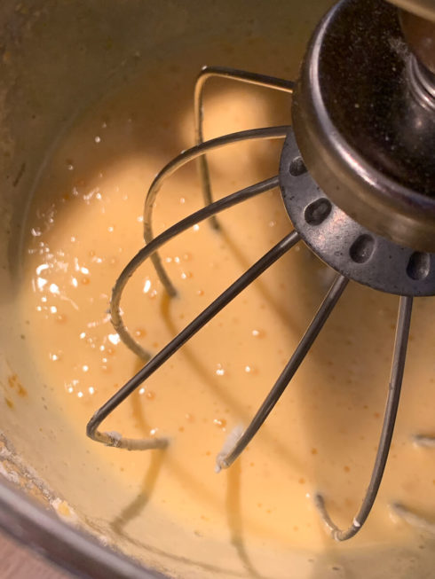 - Anschließend die Eier-Creme langsam weiter rühren und die heiße Milch durch ein Sieb langsam in die Creme geben.